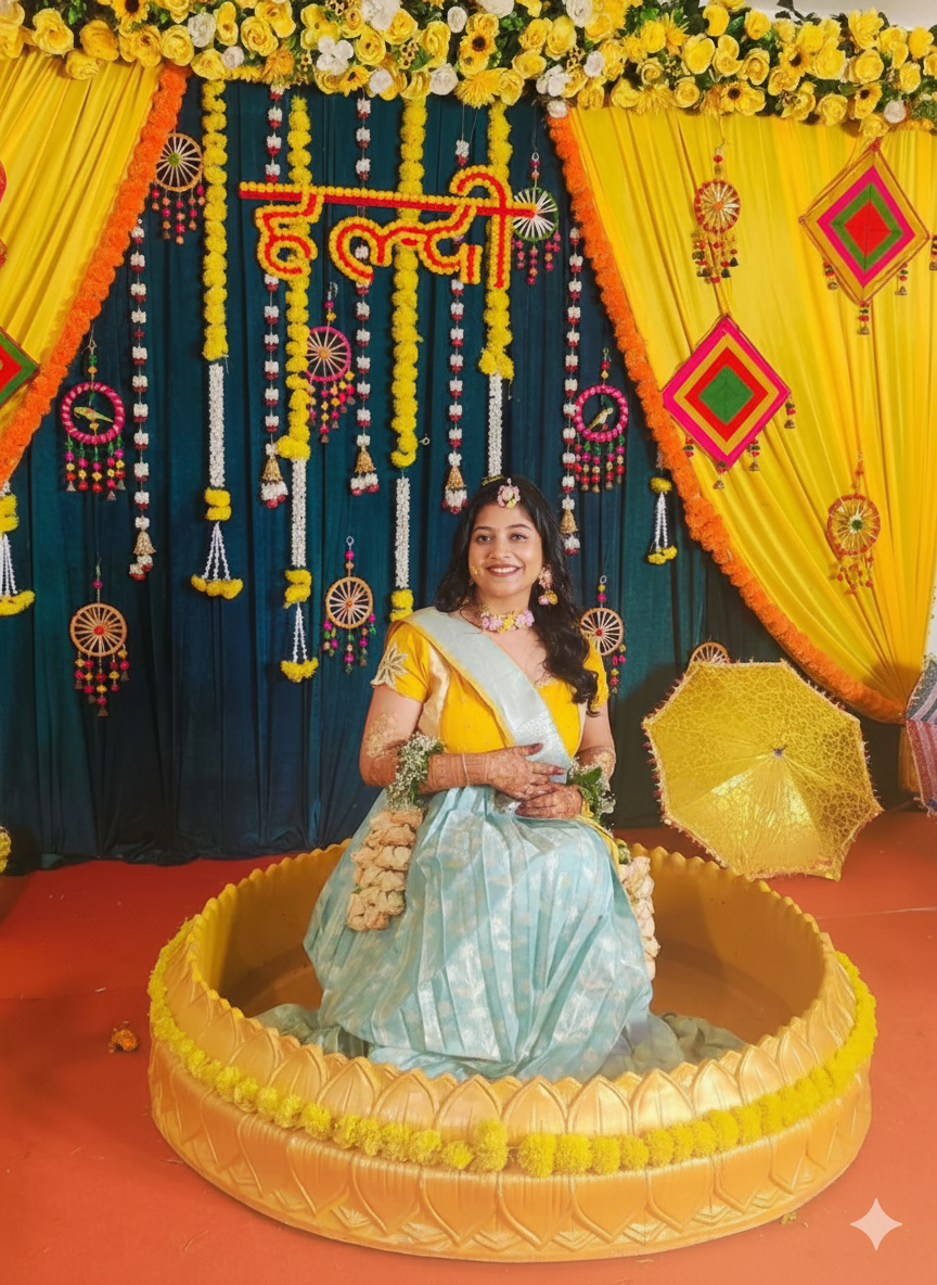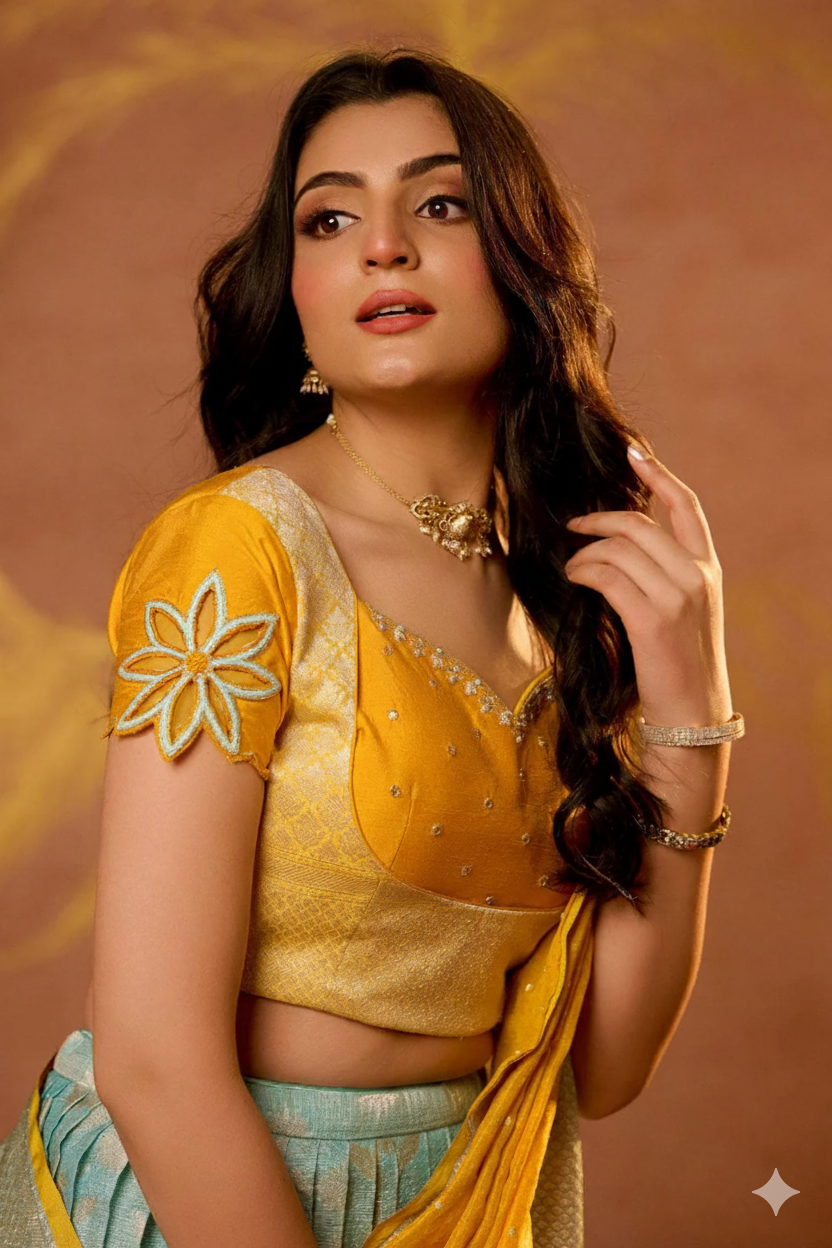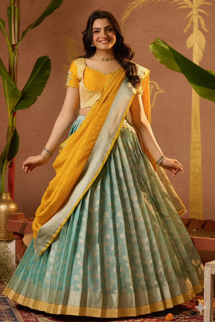 The color combination of this elegant Aadhya Lehenga Set makes a cultural vibe with a festive look set in yellow and a skirt with ice blue color, the yellow blouse has a pretty sweat-heart neckline pattern with cut dana handwork at the front part, and in this lehenga set blouse back is open U-shape, and sleeves are crafted from unique floral cutwork. The dupatta is all about softness and easy to carry of Kotta Zari fabric. The beautifully crafted 5-meter plated skirt of ice blue colour with a golden touch to the border. For a graceful look after wearing this beautiful lehenga set, go with gold or silver accessories and perfect for weddings, haldi ceremonies, traditional events, and sangeet.