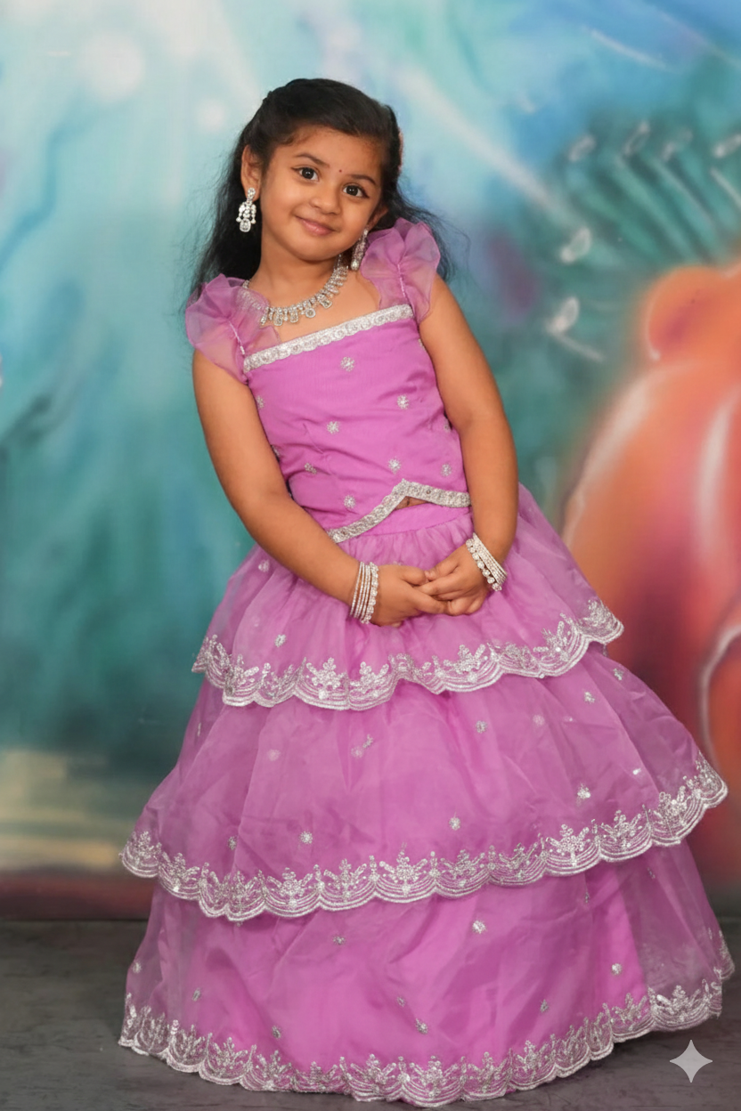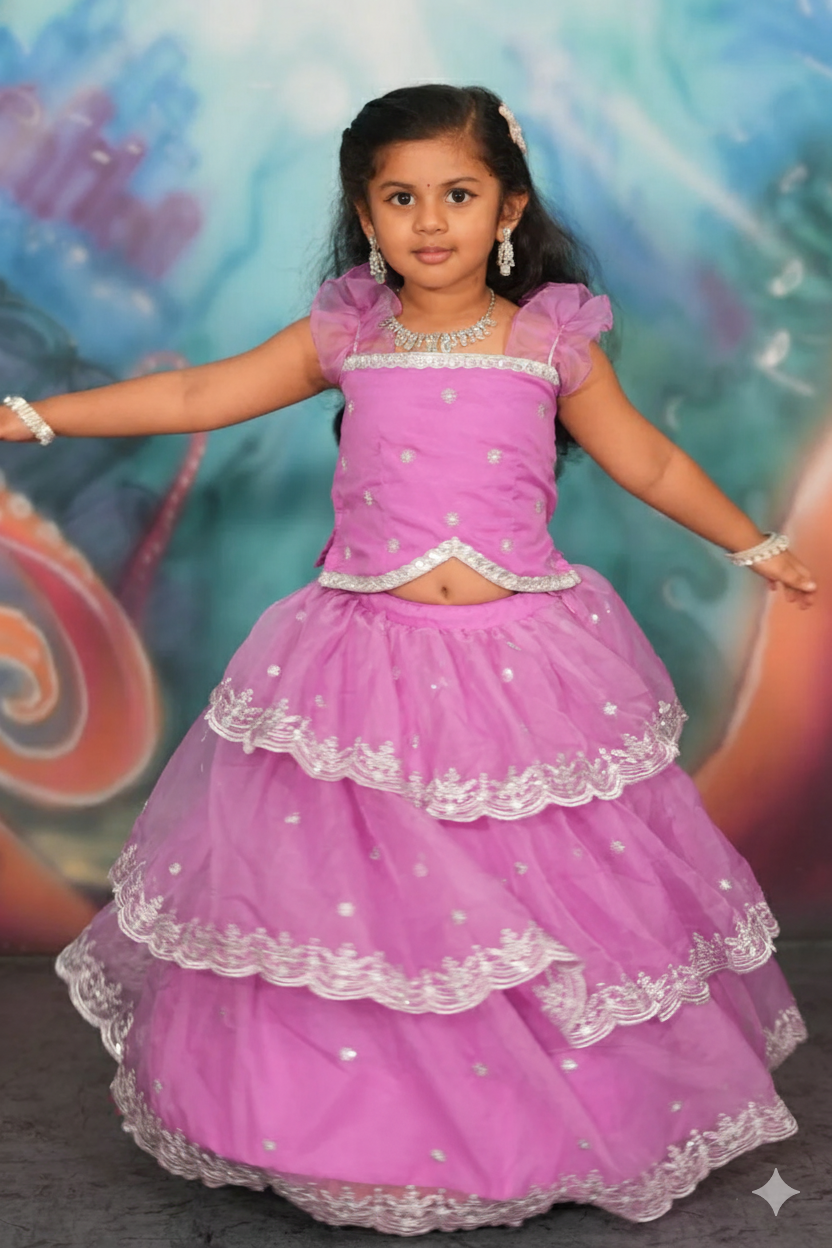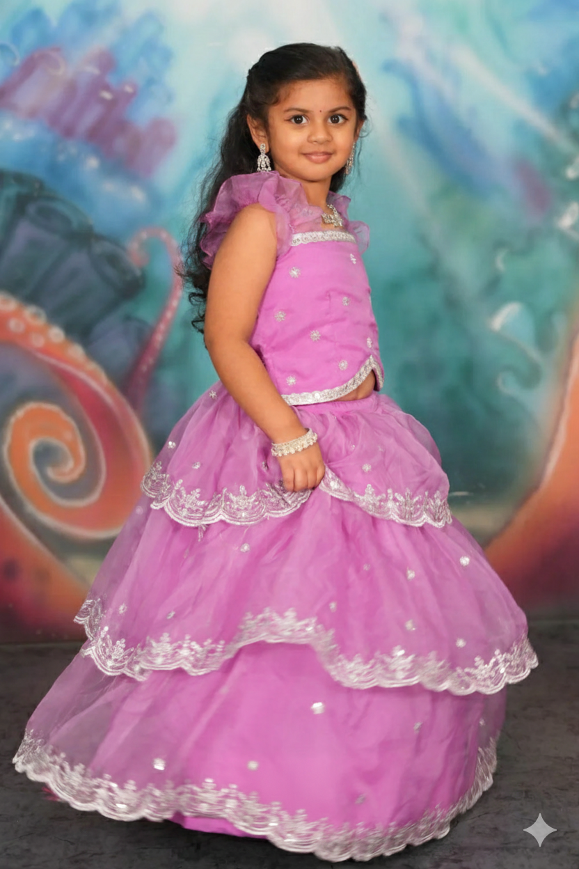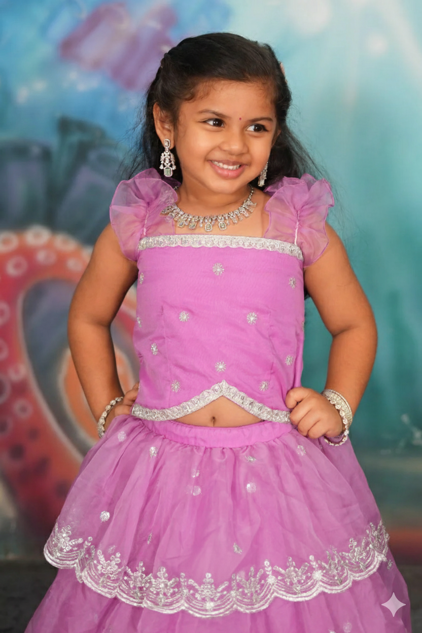 Make your Special Occasions with your little girl shine like a princess in this Baby Sumukti Lehenga Set, featuring a three-layer skirt and a frill-sleeve top with a unique bottom pattern. The soft lavender hue is perfect for special occasions, bringing out her charm and elegance. This lehenga set is crafted from soft, comfortable fabric. This set ensures all-day comfort for your little one. The addition of sweet silver-colored jewellery elevates the look, beautifully complementing the lavender and silver tones for a stunning ensemble. This lehenga set is perfect for making any celebration extra special!