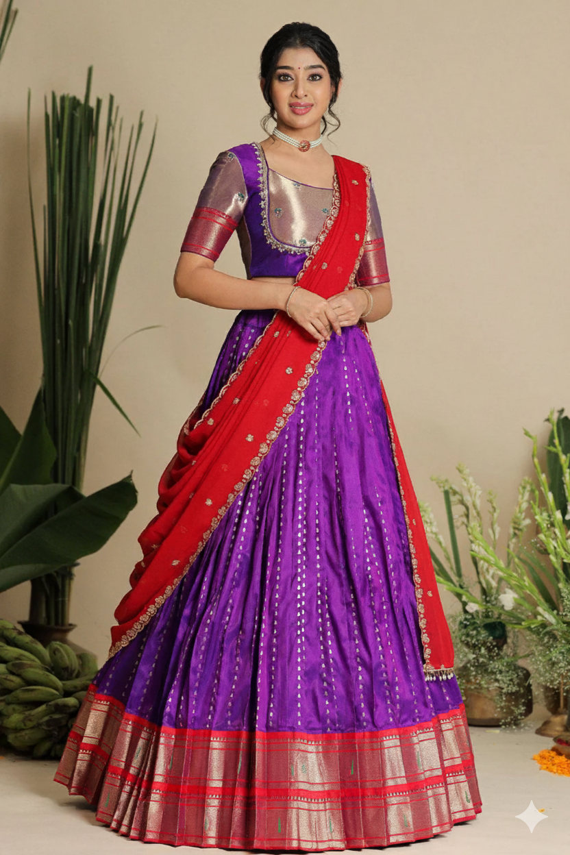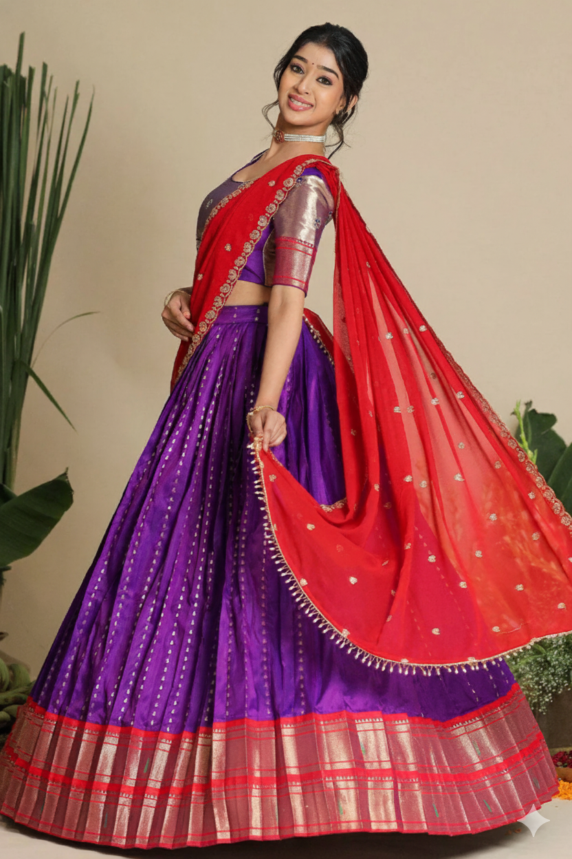 What You Will Receive: 1 fully stitched skirt, 1 fully stitched blouse and 1 Dupatta