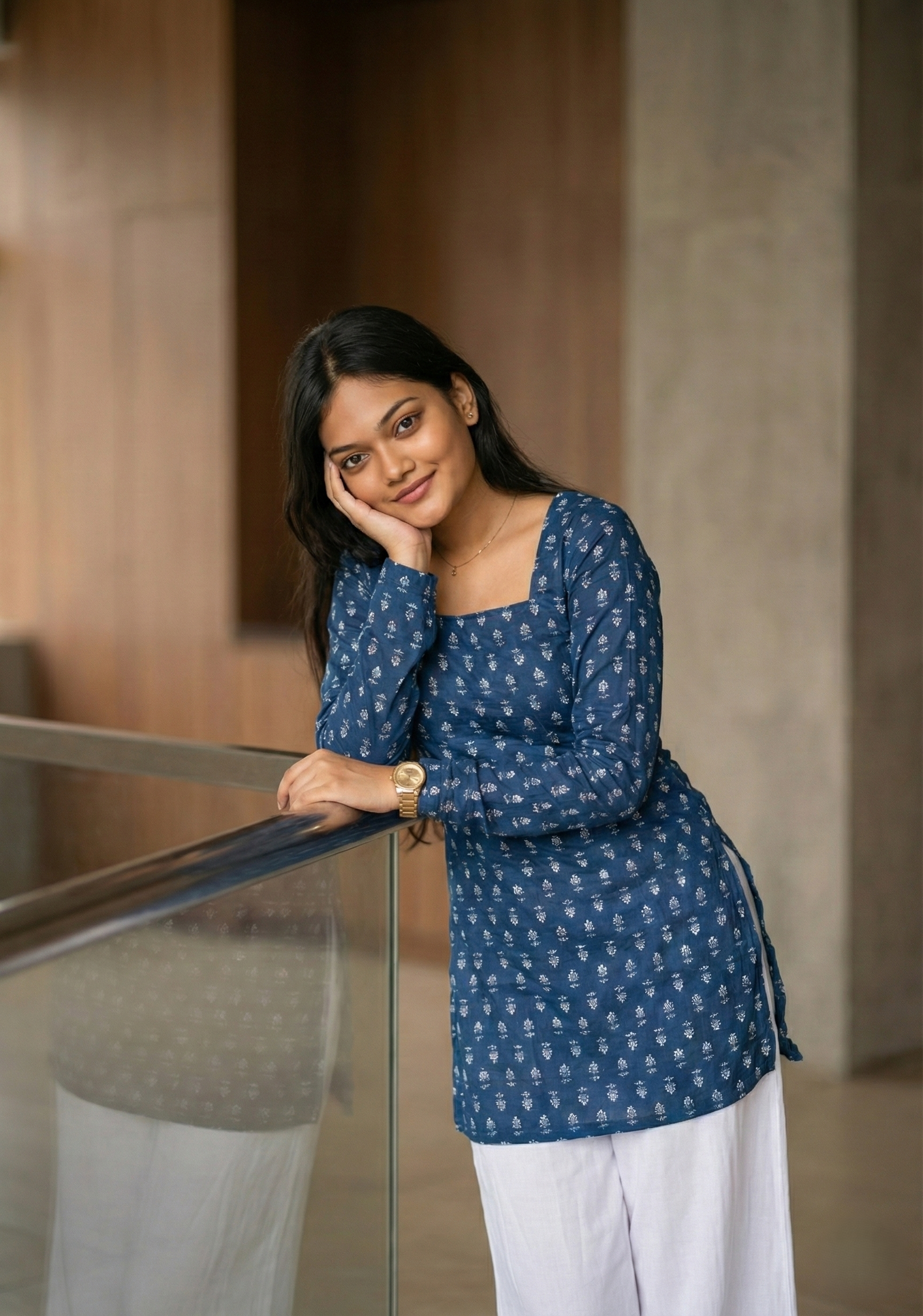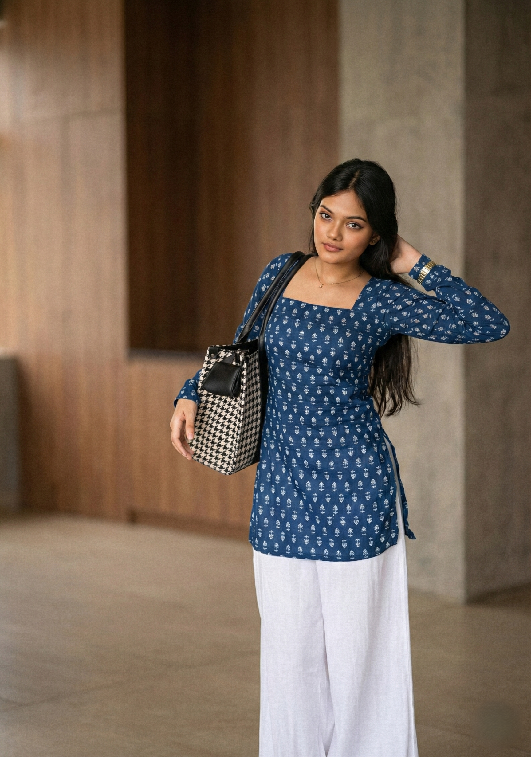 Grace your everyday ethnic style with this beautifully crafted Printed Kurta Set, featuring a deep indigo blue base adorned with delicate traditional motifs. Designed with a square neckline and full sleeves, this kurta offers a perfect balance of elegance and comfort. The straight silhouette with side tie-up detailing enhances the overall fit while adding a subtle designer touch.