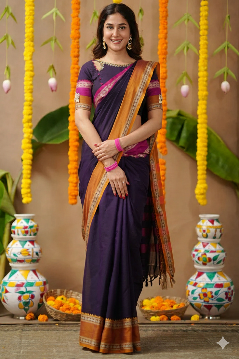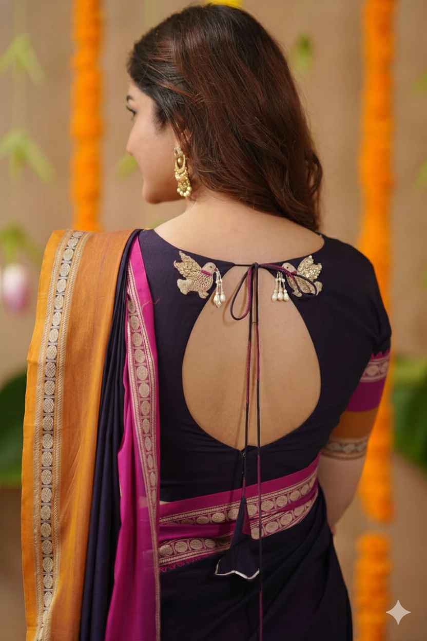 Work: Hand embroidery with sequin detailing & Authentic Border Pattu design in rich contrasting tones.