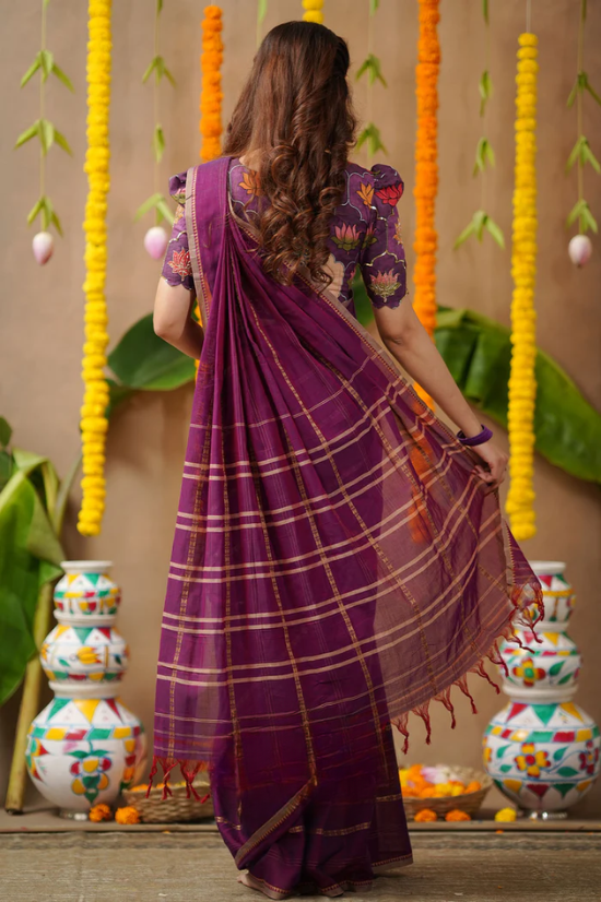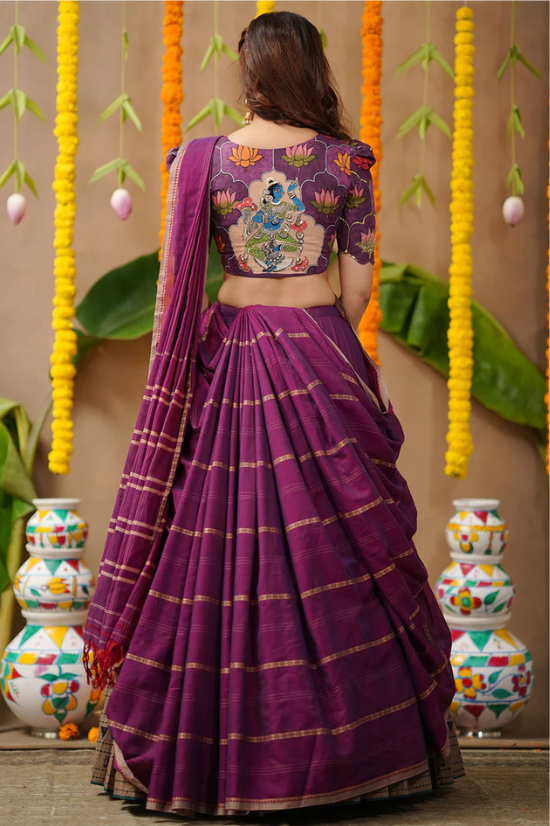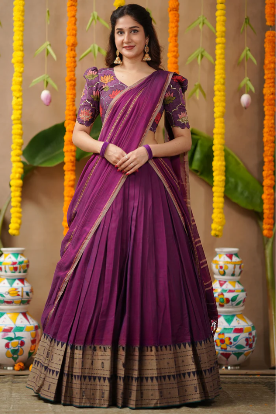Crafted from pure handloom silk, this ensemble celebrates Indian craftsmanship with its Pattu border detailing and intricate handwork. The lotus motifs on the blouse add a divine charm, while the Narthaki motif on the back reflects cultural grace and artistic heritage. The sweetheart neckline and elbow-length sleeves lend it a touch of elegance and femininity.