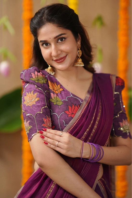 ✨ Look 1: Drape the 5.5-meter saree with the intricately embroidered blouse for a timeless traditional appearance.