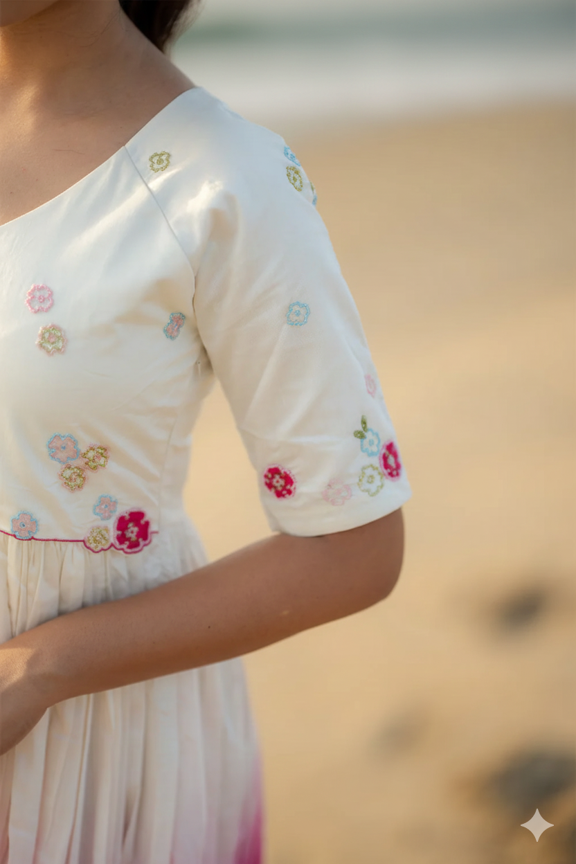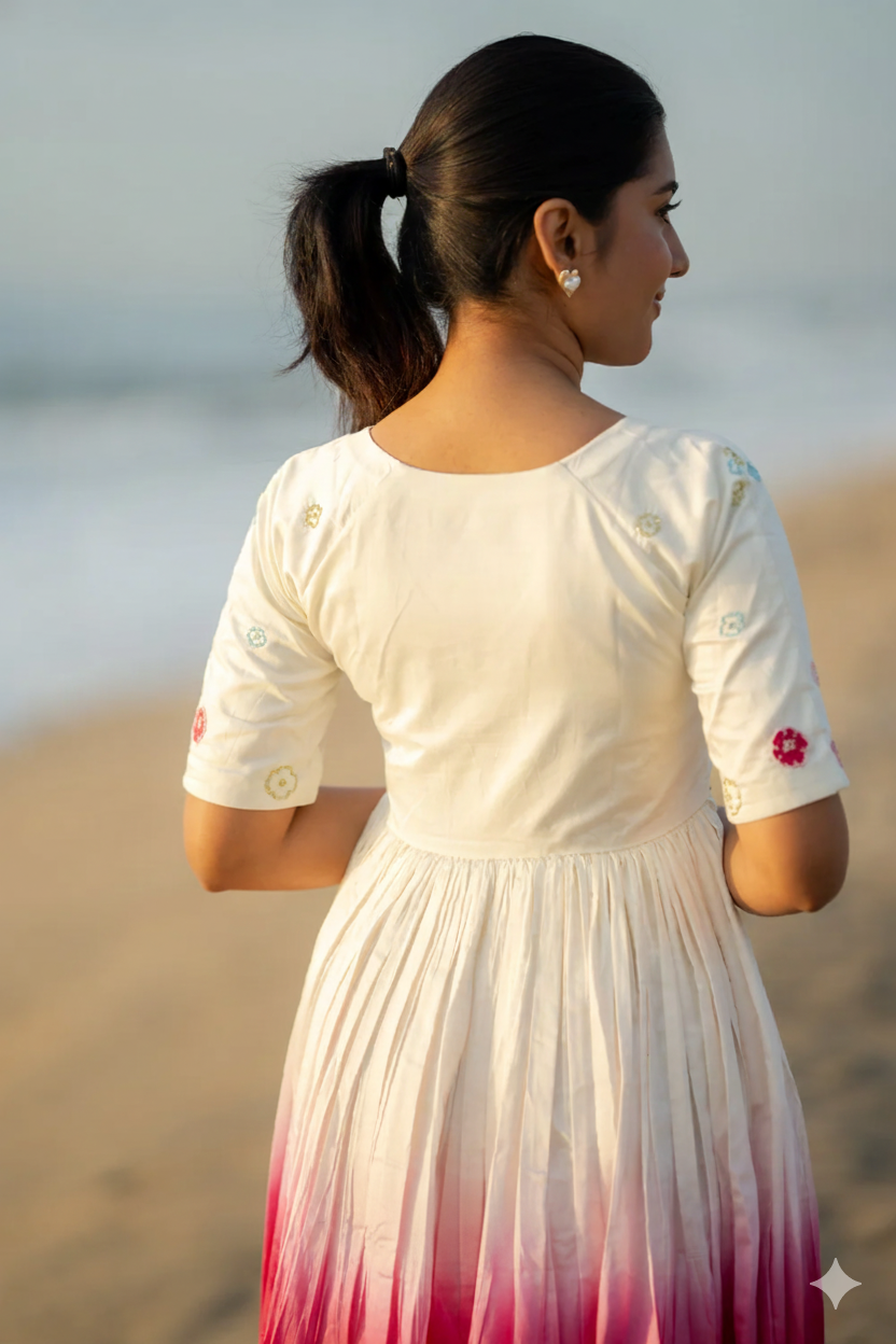 Meet the beautiful Niaa Midi Dress, a stylish and comfortable dress perfect for any special day. This dress is made from fine Chanderi fabric and is a mix of white and pink color. The top part is white, and it fades into a bright pink on the bottom, giving it a lovely look. We added delicate handwork on the top and cutout design to make it extra special. It has comfortable Raglan sleeves and a full flare skirt-type midi. Best of all, it includes pockets! This dress is easy to wear and perfect for looking great wherever you go.