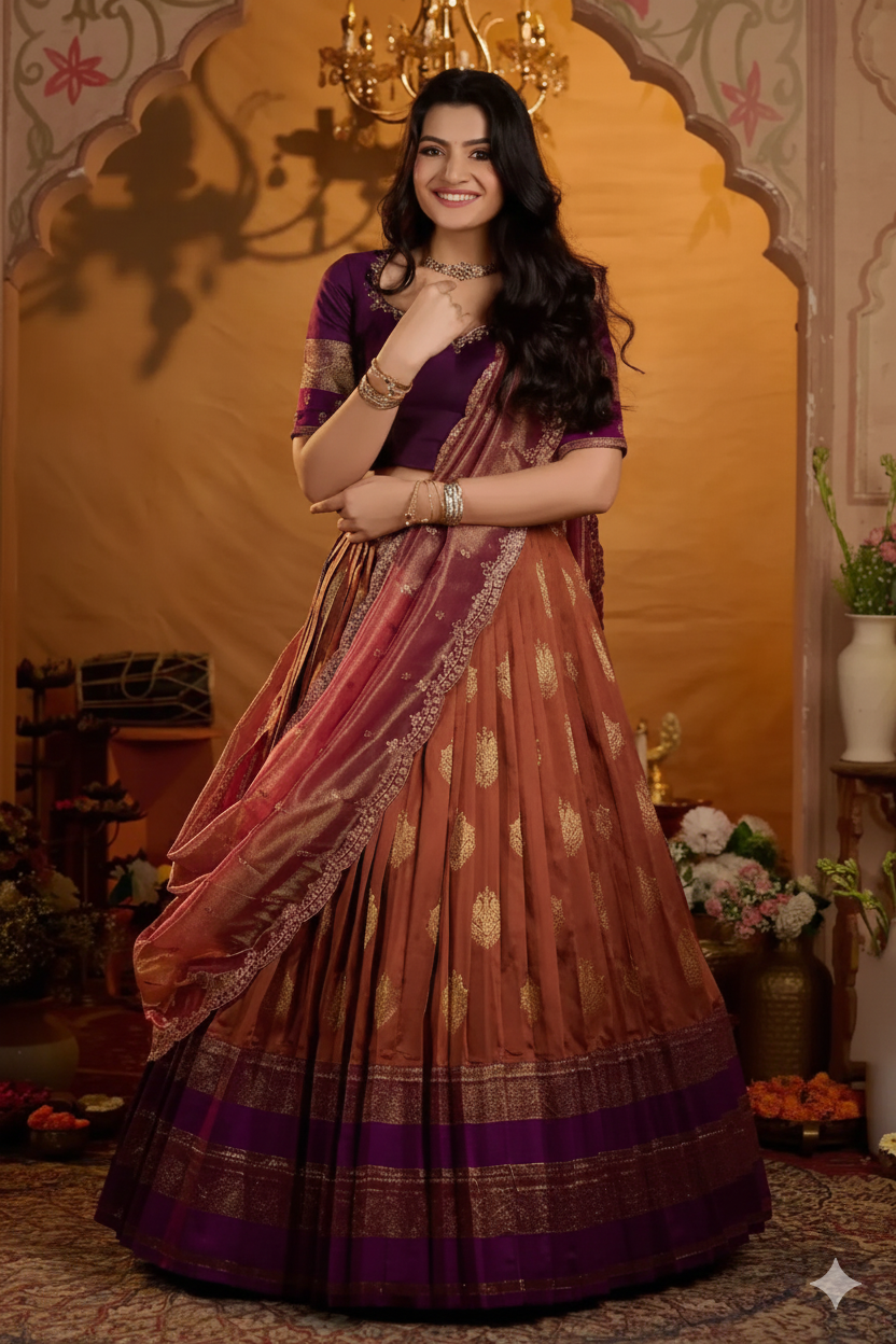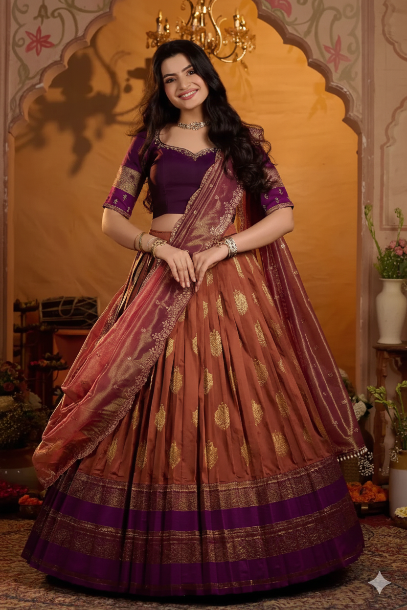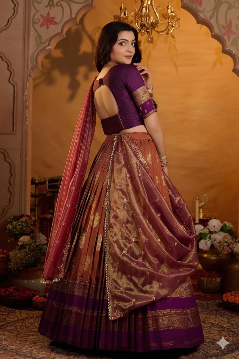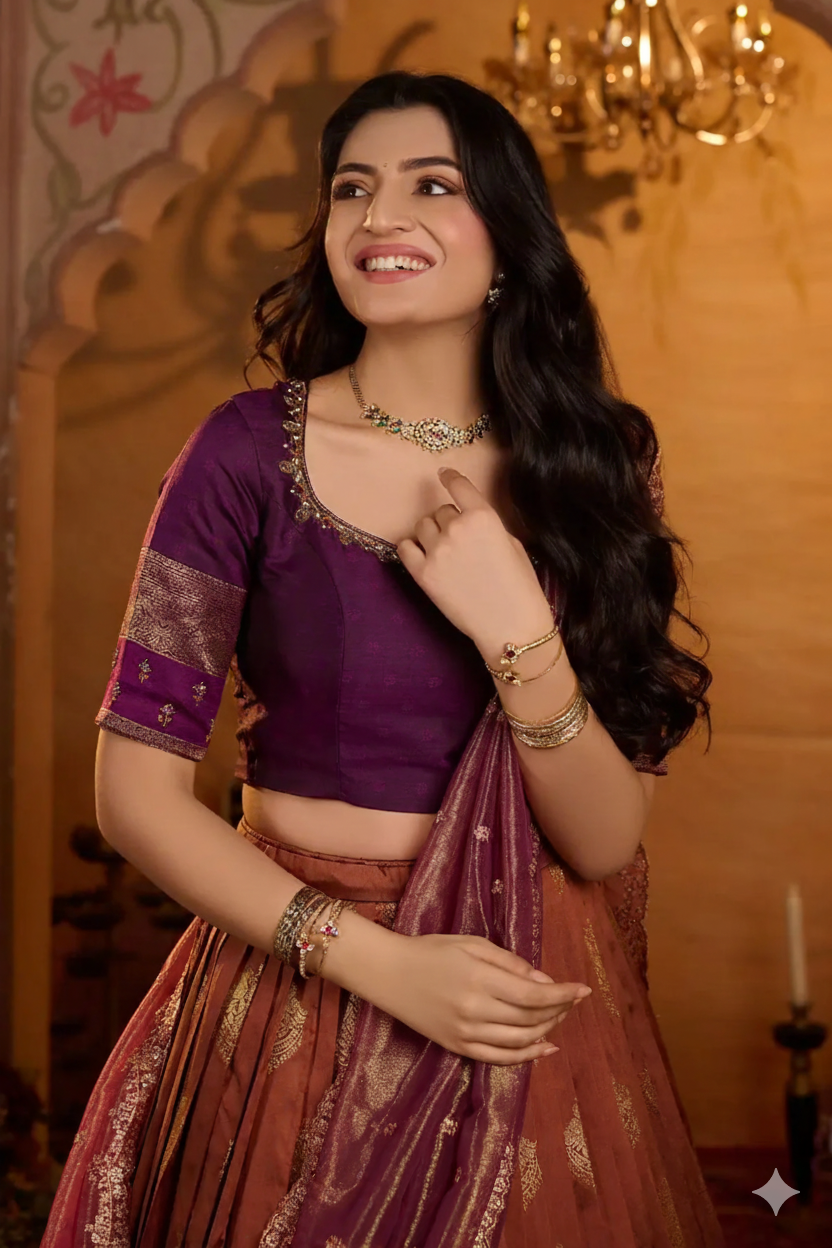 This stunning lehenga set beautifully blends rich fabrics with intricate detailing, making it a perfect choice for weddings and festive occasions. The skirt is crafted from luxurious Gadval silk, designed in an earthy rust tone with golden motifs and a deep purple border that adds regal contrast. The blouse, made from soft silk, features a chic silhouette with handwork embellishments for a refined touch. Completing the look is a graceful shimmer net dupatta, enhanced with delicate handwork that adds just the right amount of sparkle. Elegant, comfortable, and ready to wear, this ensemble is a timeless addition to your festive wardrobe.