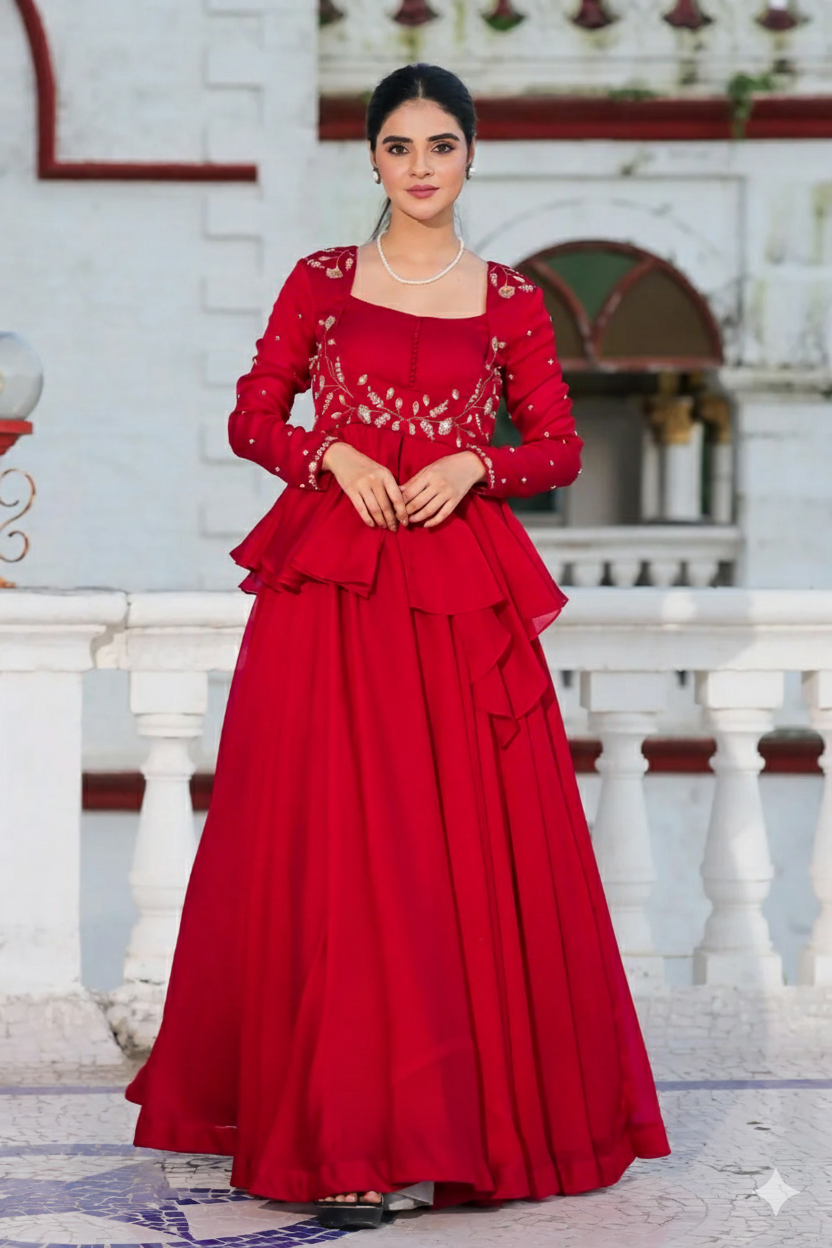 We are introducing our Very First Indowesteren series. This beautiful Salvia Red Indowesteren Set. This beautiful Indowesteren set, crafted in vibrant hot red, is made from luxurious Chinnon chiffon fabric, offering a perfect blend of tradition and contemporary style. with an intricate glass sequence bead handwork detailing on the yoke and the sleeves. It has a modern peplum top with a Potli detailing on the yoke and one side coul pattern, which makes it perfect for any occasion.