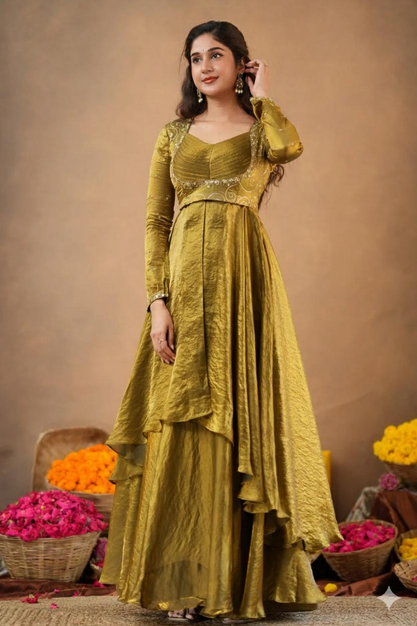 Stylista 2-In-1 Indo Western Olive Gold Lehenga Madhubala Neckline
