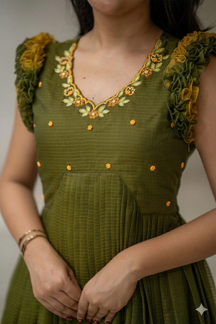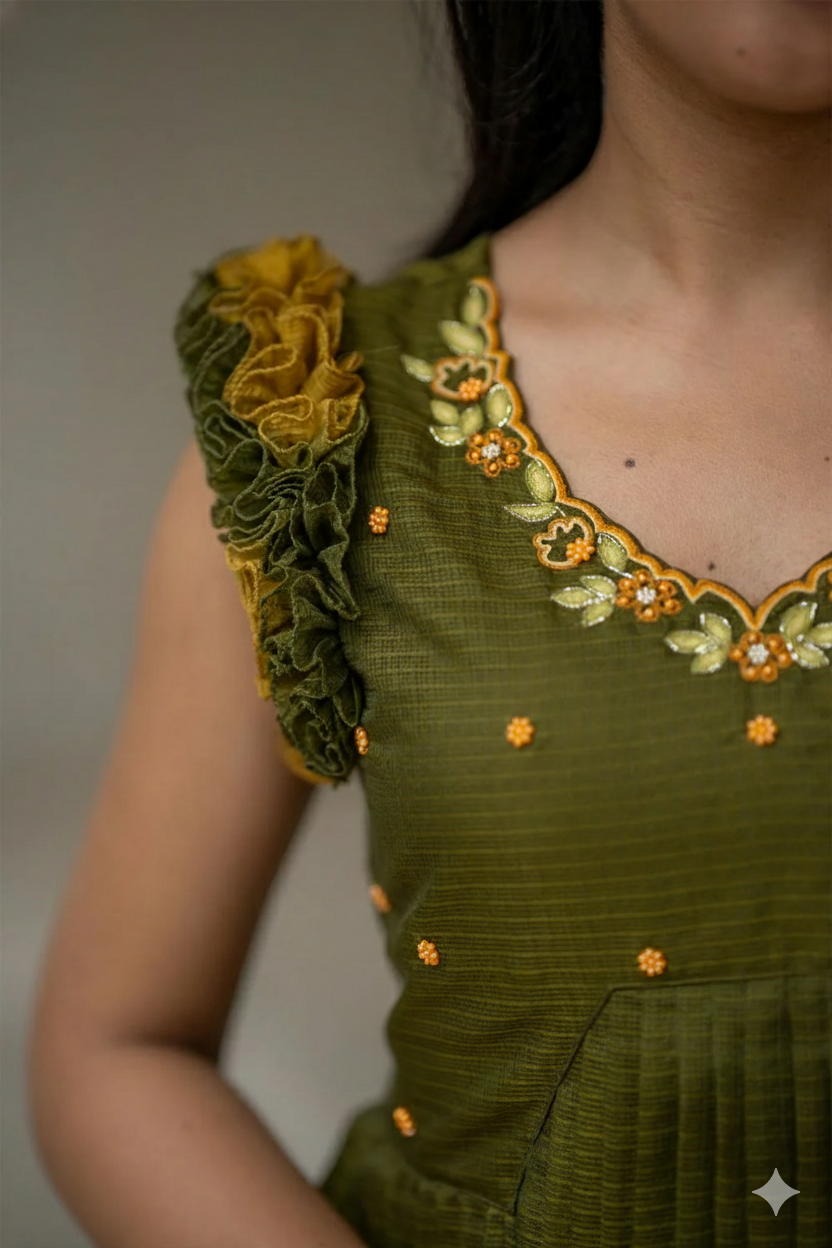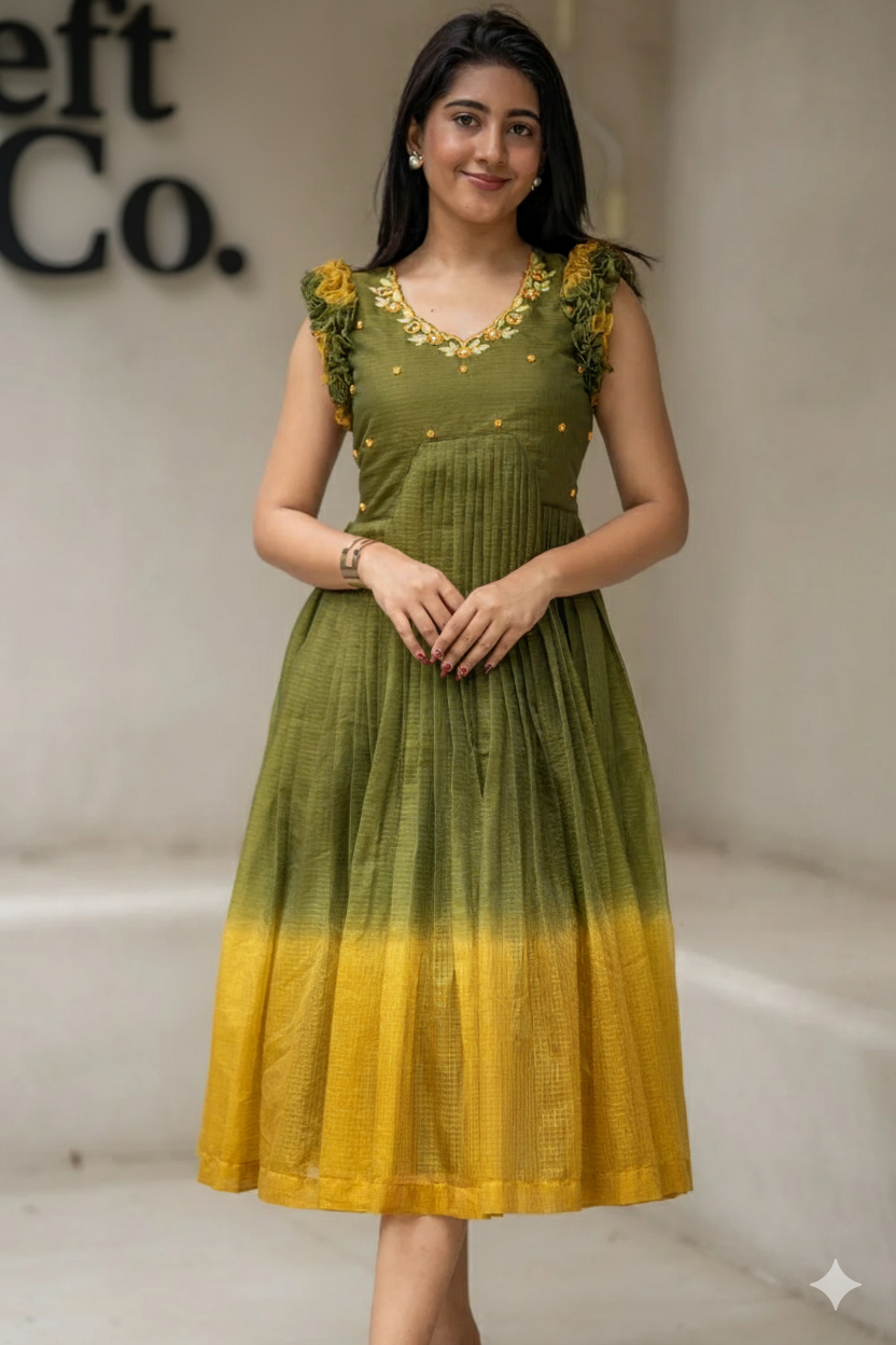 Celebrate in style with this beautiful TeraCotta Olive Green kota Raffle Midi Dress. Made from breathable Kota , it features a two-tone ombre from Olive Green to Mustard Yellow, delicate handwork on the bodice, and playful Raffle Sleeves with very fine, delicate lines or small, intricate motifs.. Perfect for Mehendi, Haldi, or festive gatherings, it offers a flattering silhouette with a concealed side zip. Pair with minimal jewellery and heels for a chic ethnic look.