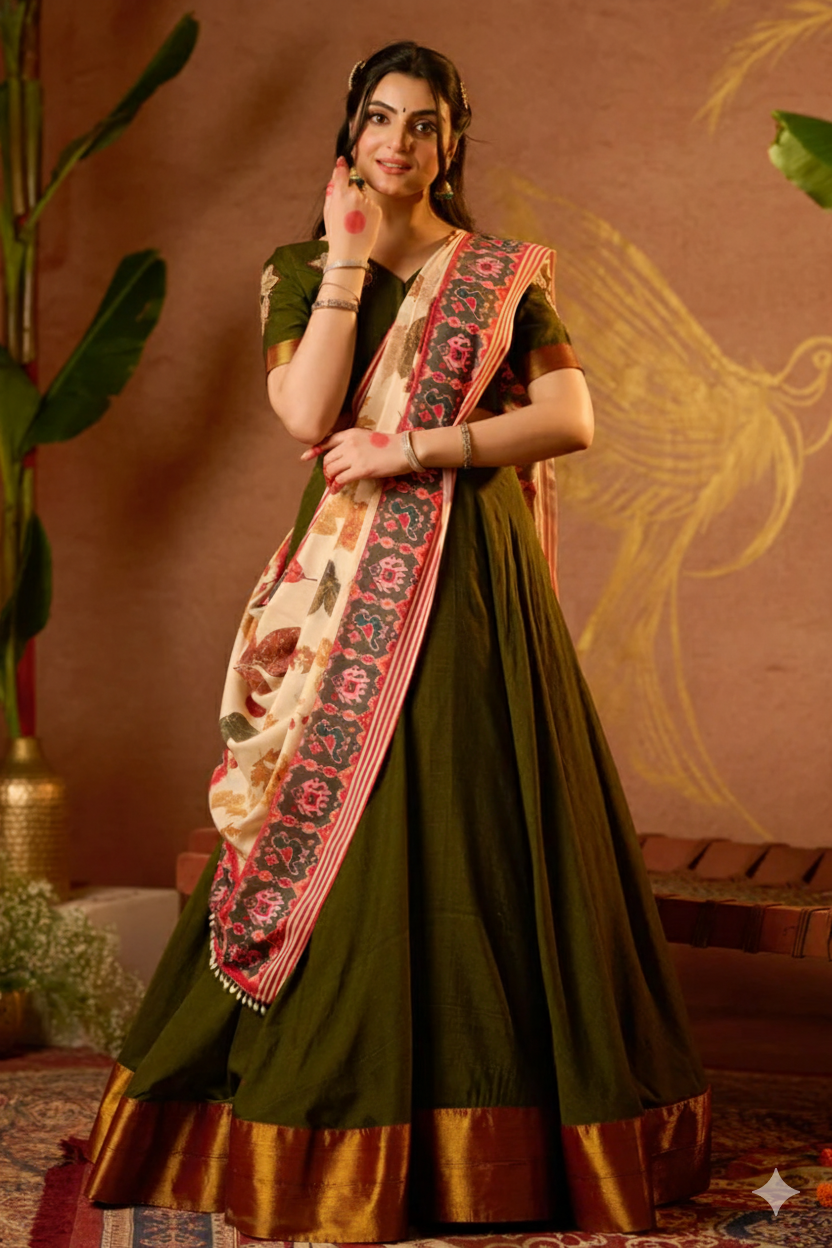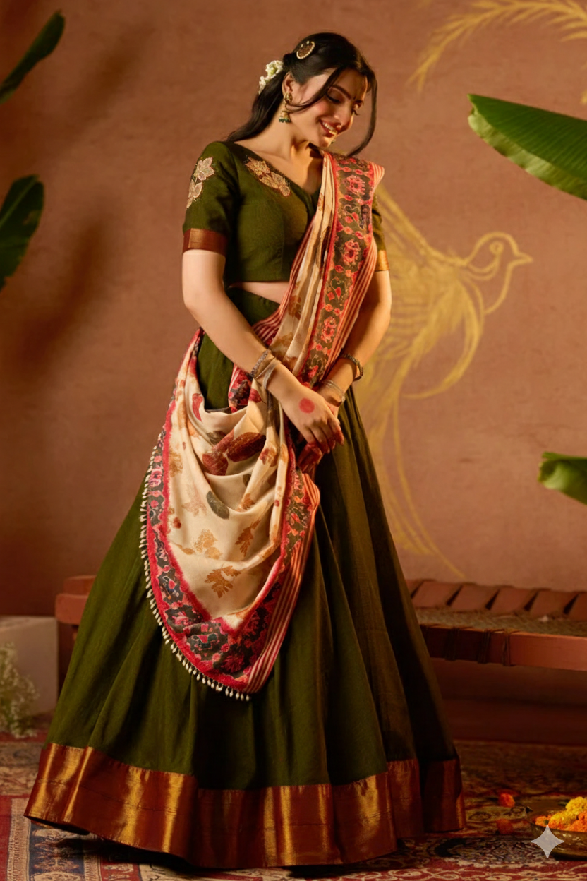 Discovering a wedding vibe, this tithi lehenga set is perfect to wear. The V-neckline blouse at the front as well as at the backside, a pattern with one-sided floral patchwork of the blouse adds a stunning look. The same patch works on sleeves with golden thread weaving. The eco-print dupatta and 5-meter umbrella flare skirt add a traditional charm to the overall attire. Perfect for mehendi functions, homely occasions, and cultural functions, this langa voni blends perfectly with South Indian traditional jewellery.