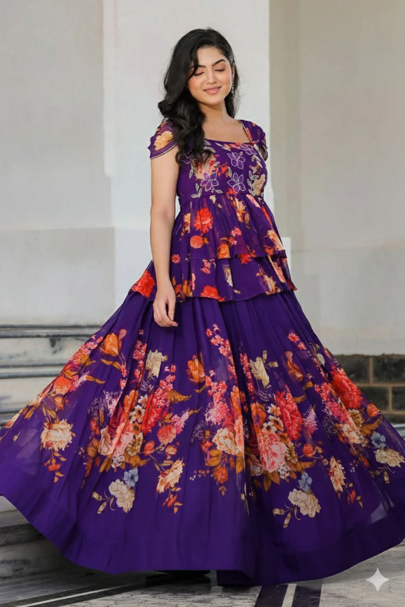Discover your style with Ziana Indowestern in a Purple outfit, designed with eye-catching floral patterns in red and peach. This IndoWestern beautiful gown is crafted with floral hand embroidery and features a trendy top design with stylish sleeves, adding a modern touch. The layered peplum-style top introduces a contemporary twist to the traditional silhouette in this IndoWestern Gown. Pair it with the flowing skirt embellished with large floral prints to create a dramatic and elegant look. I recommend you wear an accessory with pearl-crafted jewellery to complement the grace and charm of the outfit.